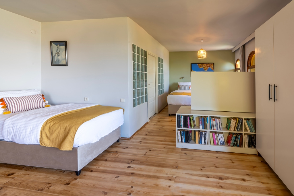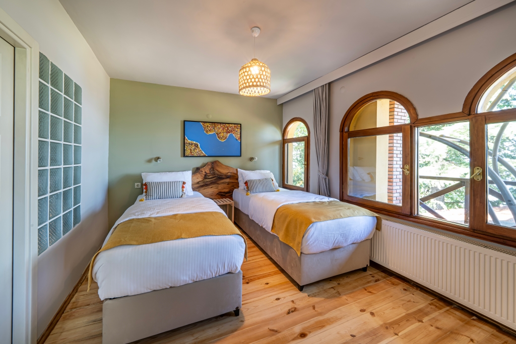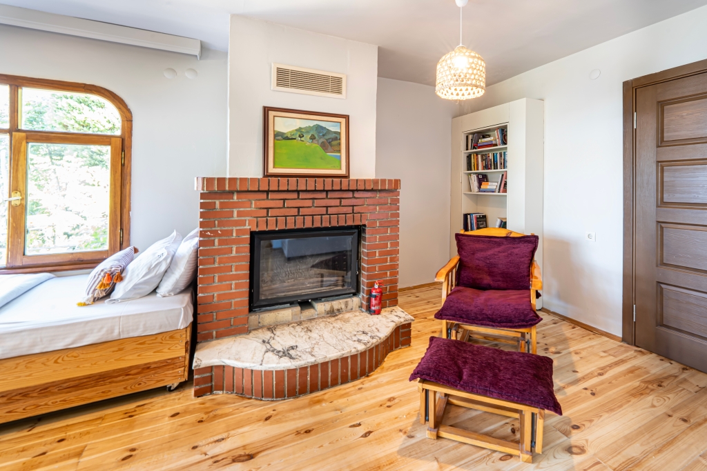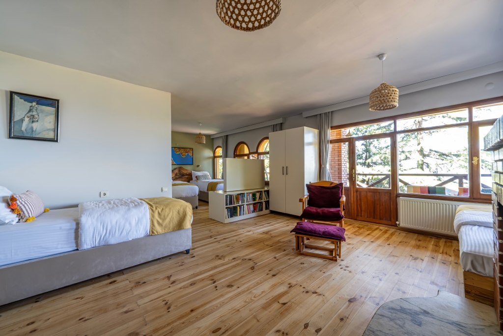 Şömineli balkonlu Gürgen odamızda dört adet tek kişilik yatak bulunmaktadır.